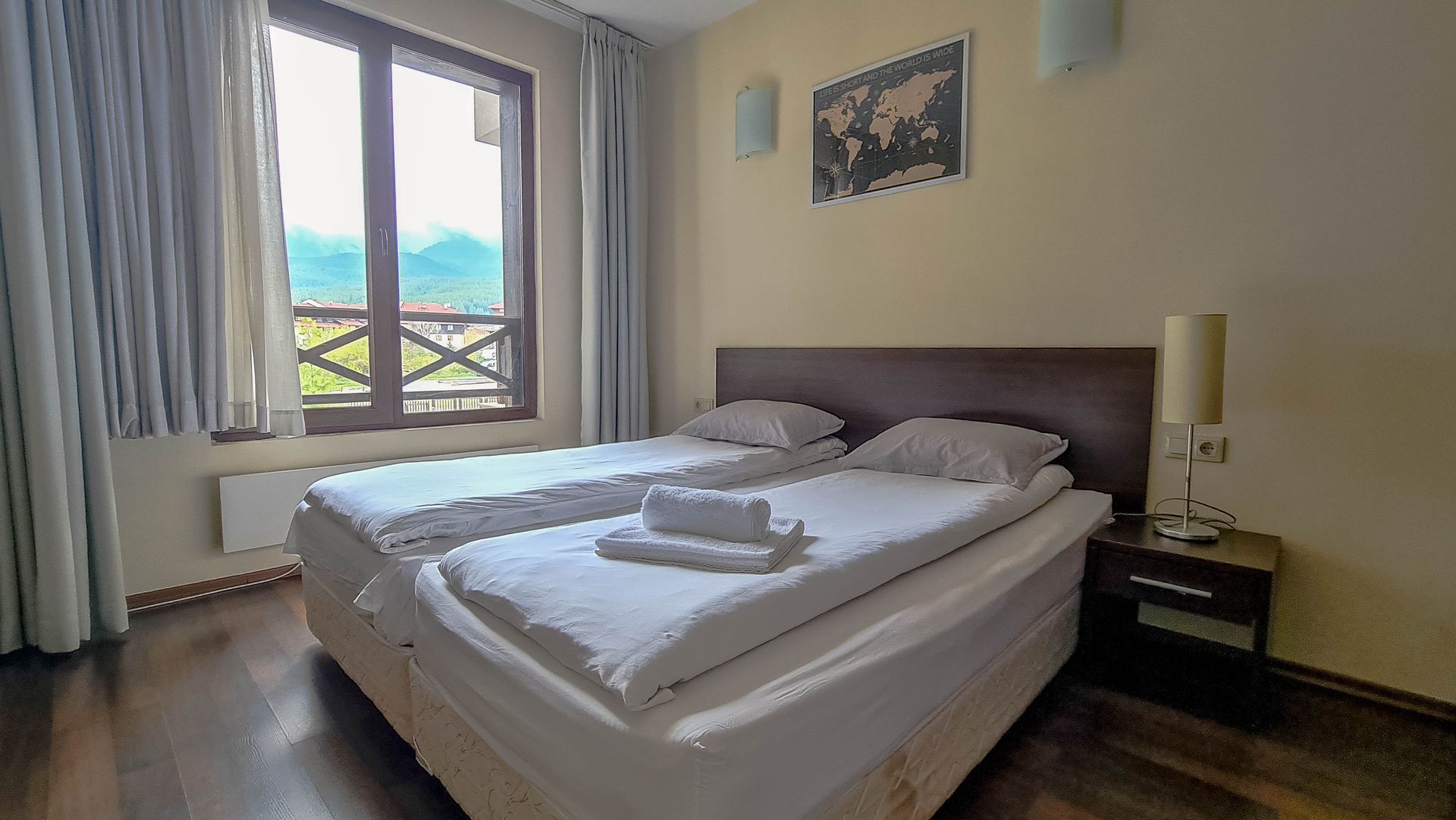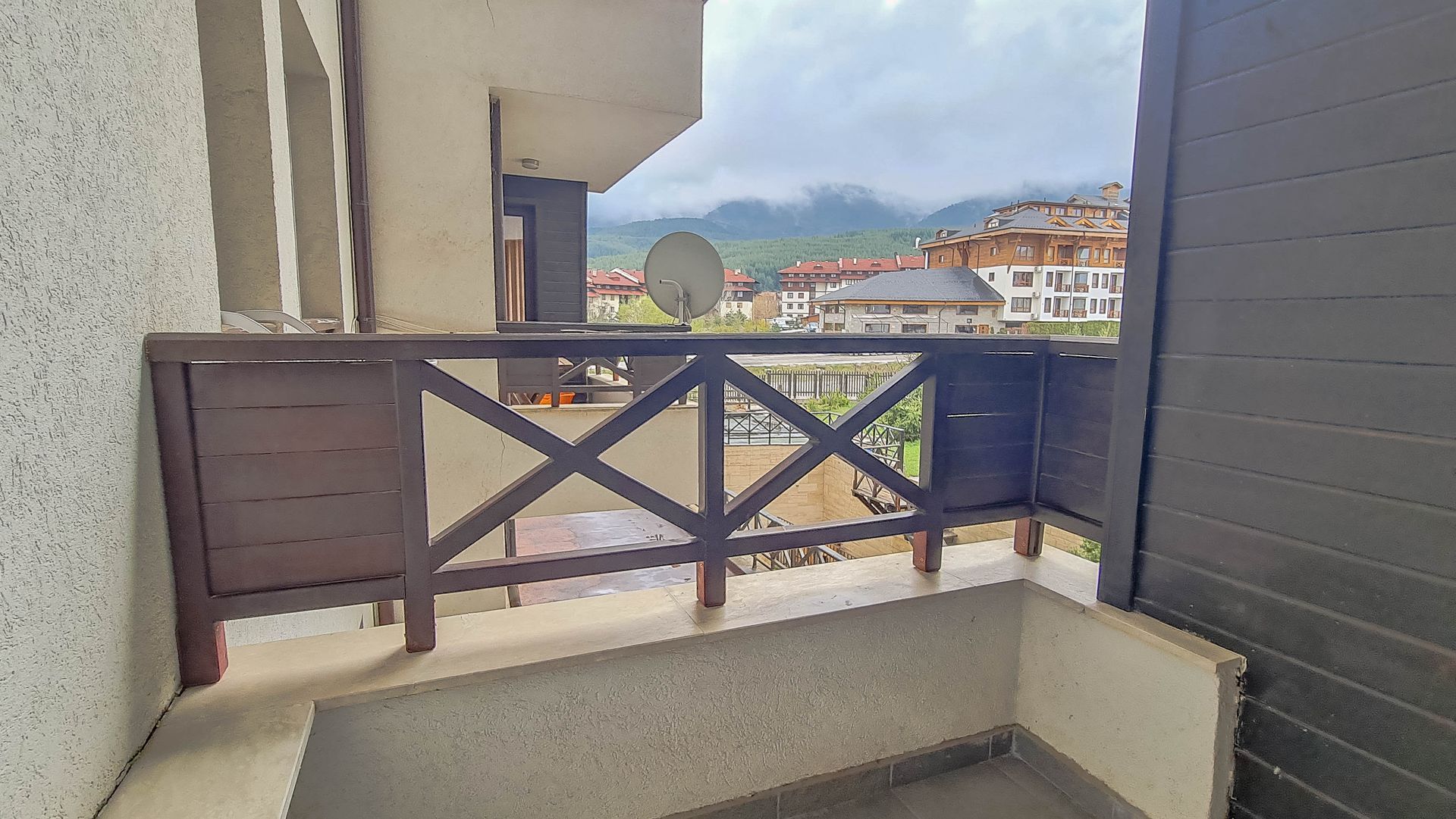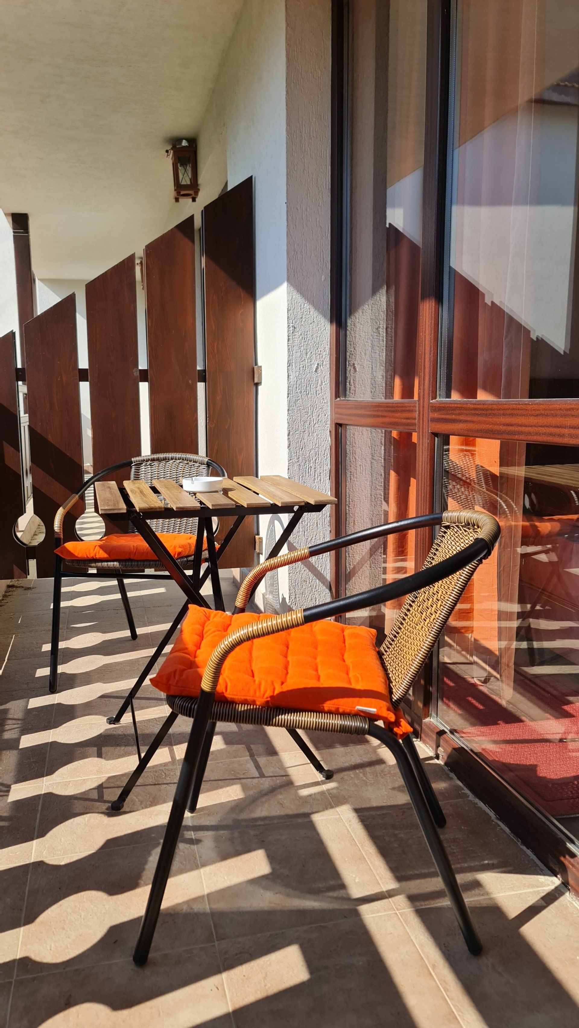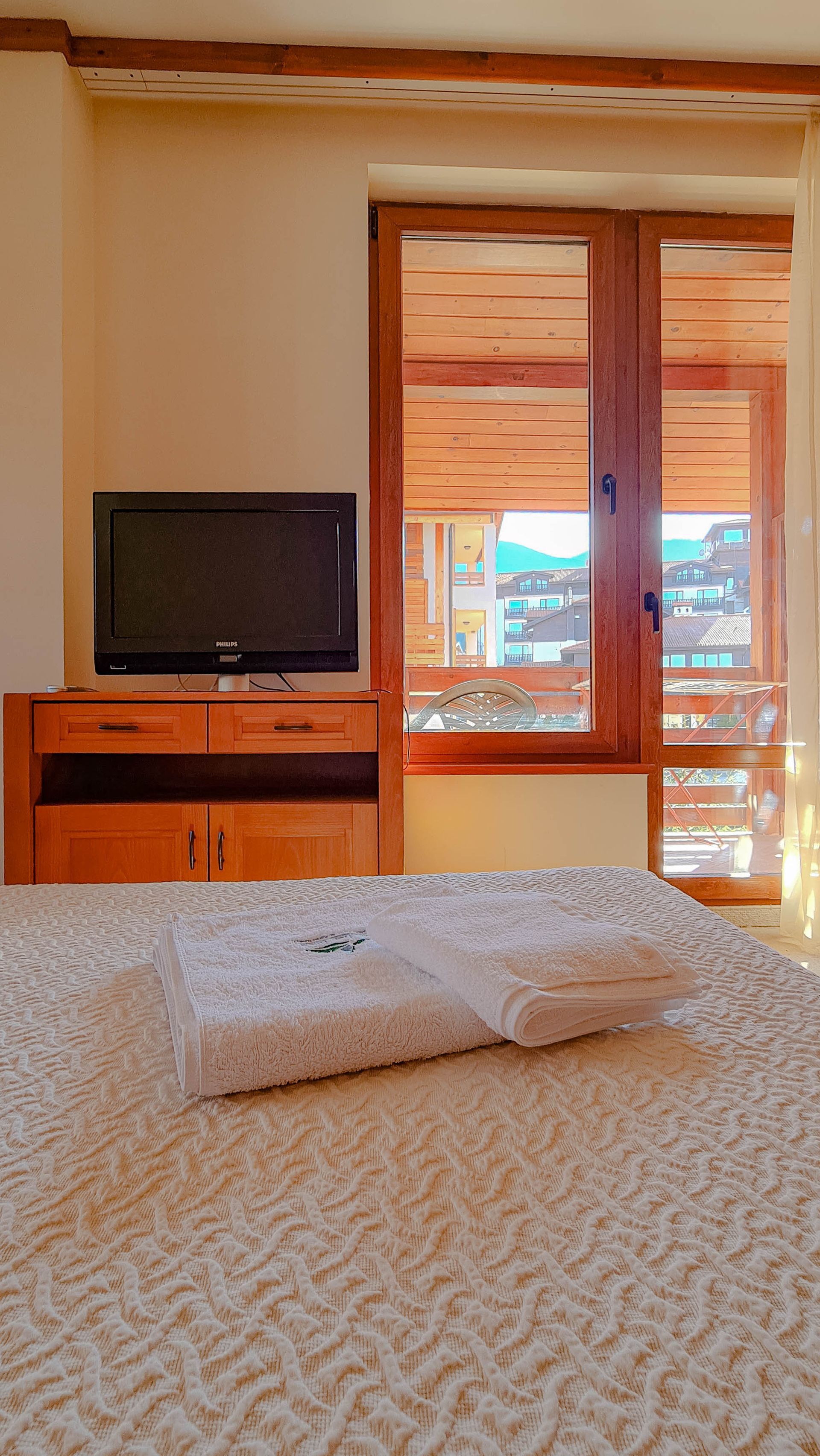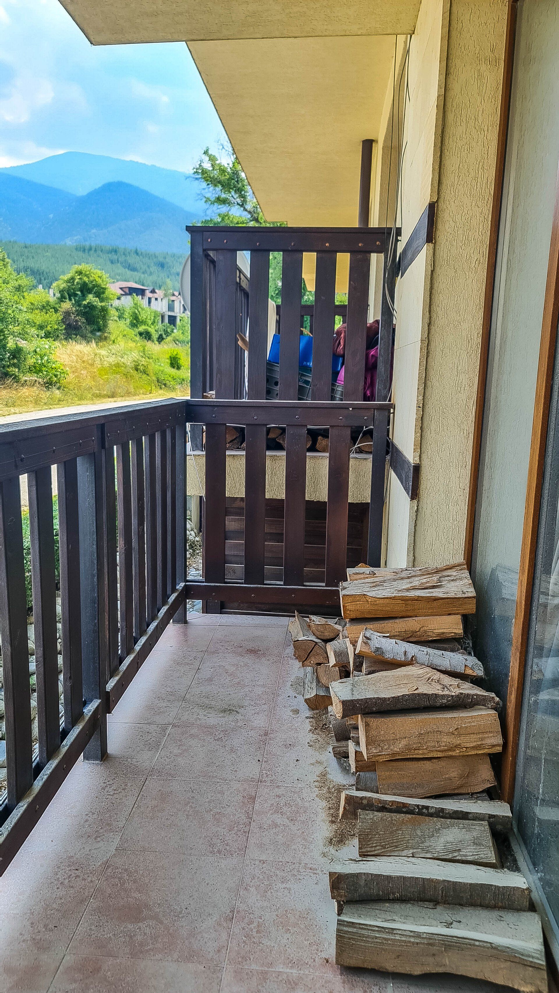 The apartment has a cozy bedroom for 3 people, beautiful balcony with mountain views, a storage room with a washing machine and a water heater.