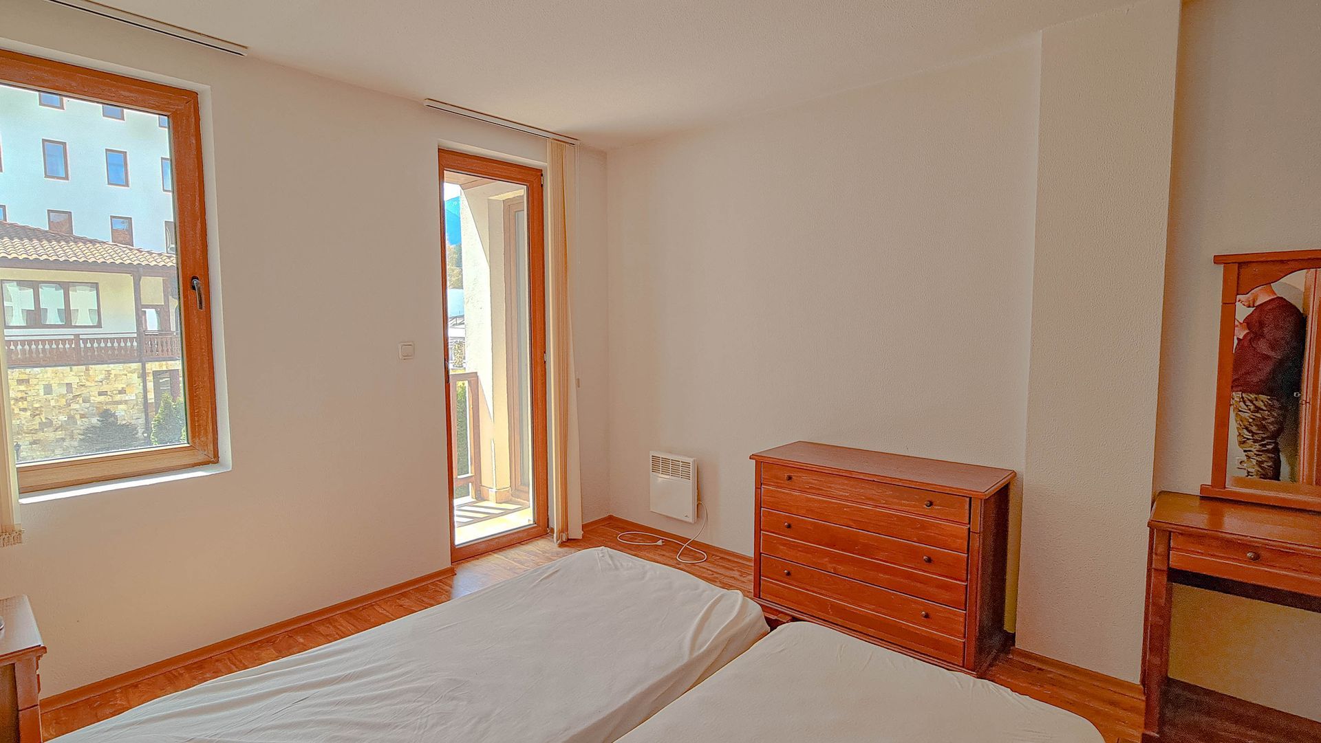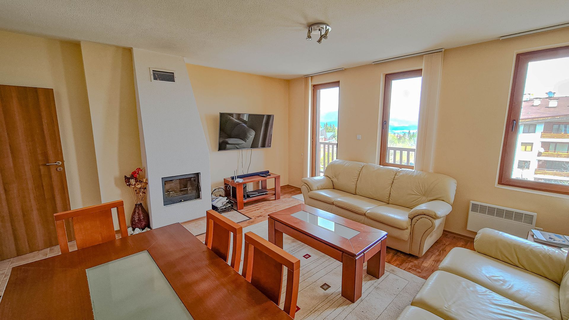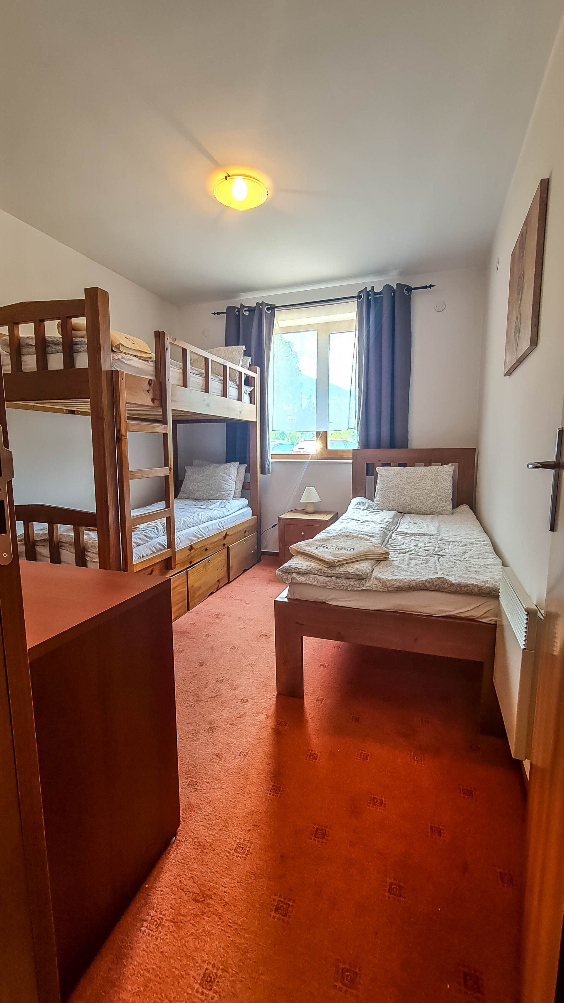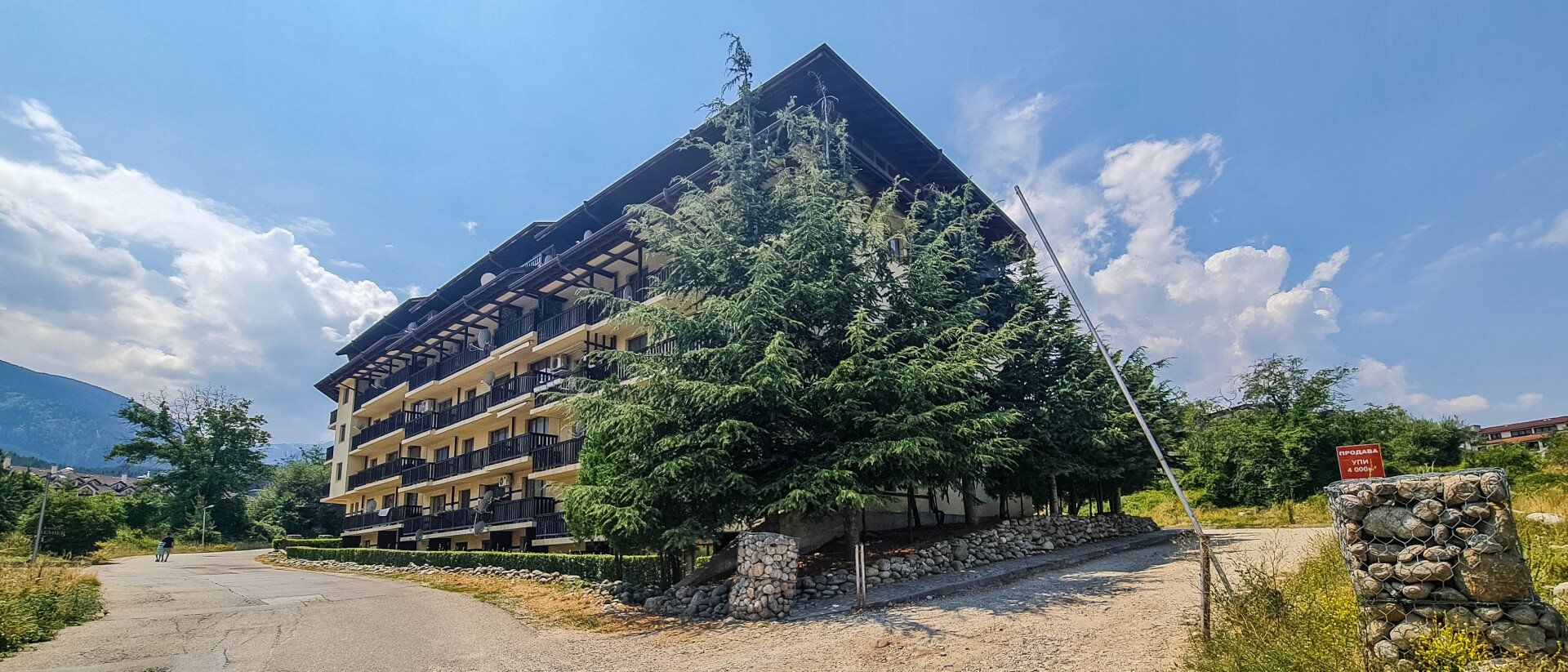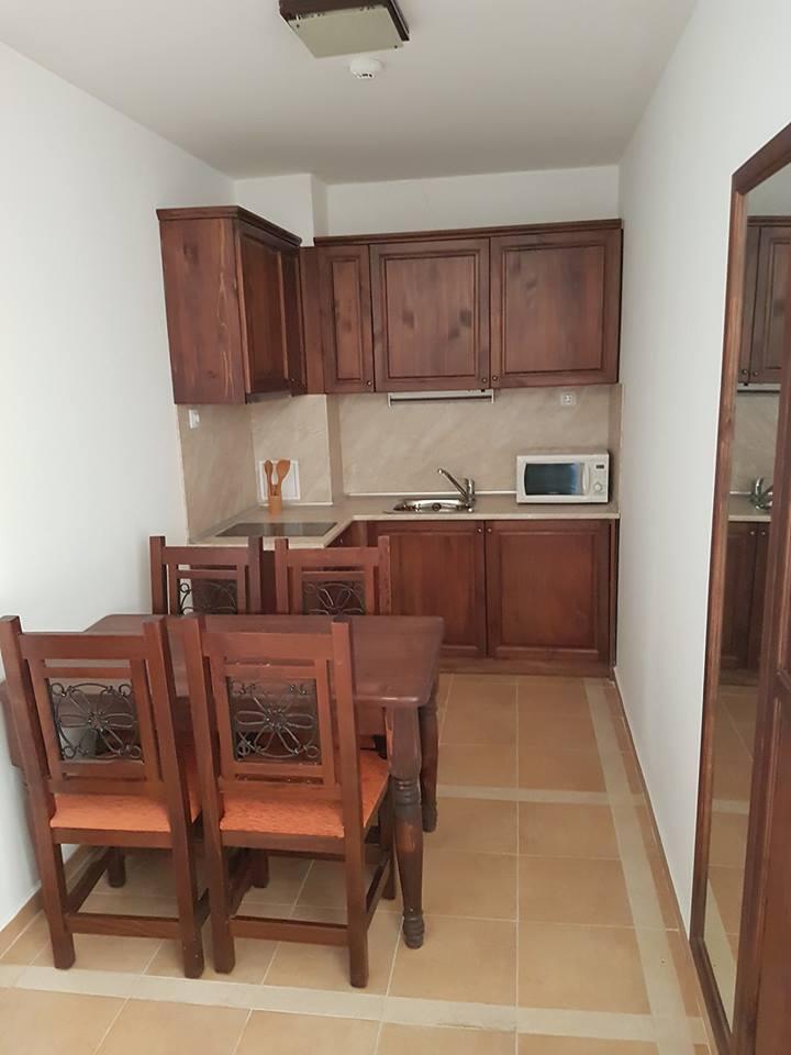 The apartment has a cozy bedroom for 3 people, beautiful balcony with mountain views, a storage room with a washing machine and a water heater.