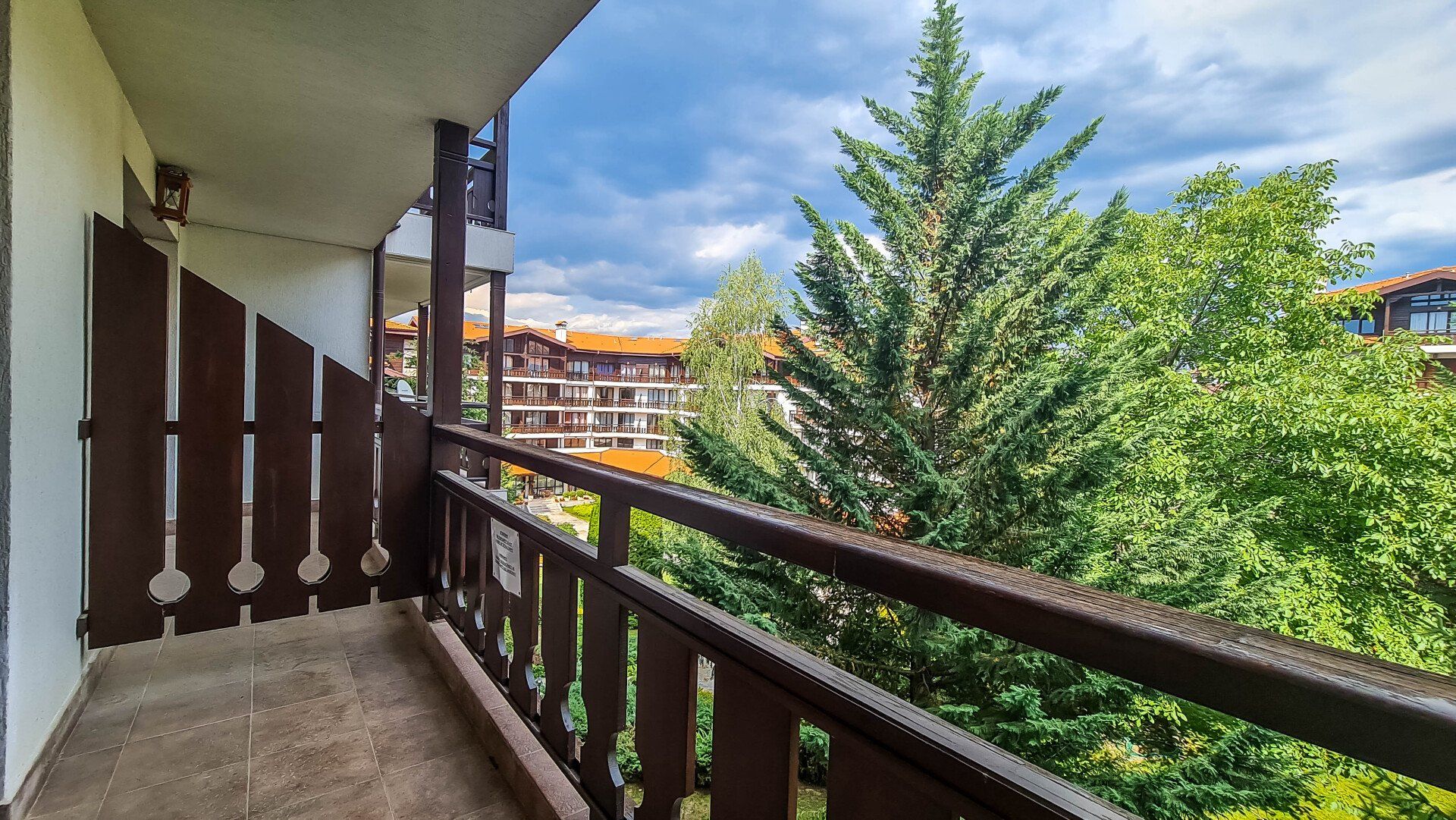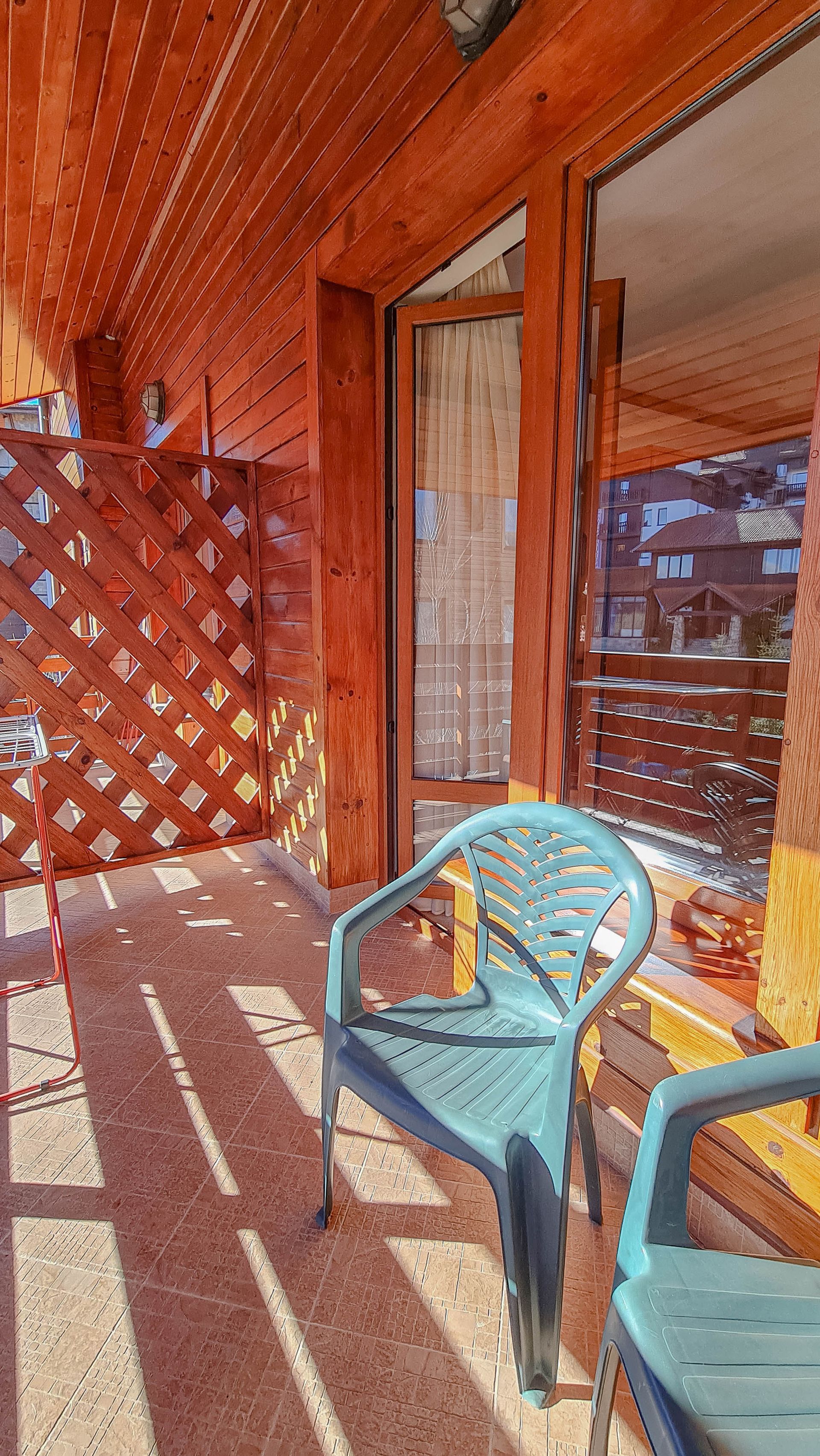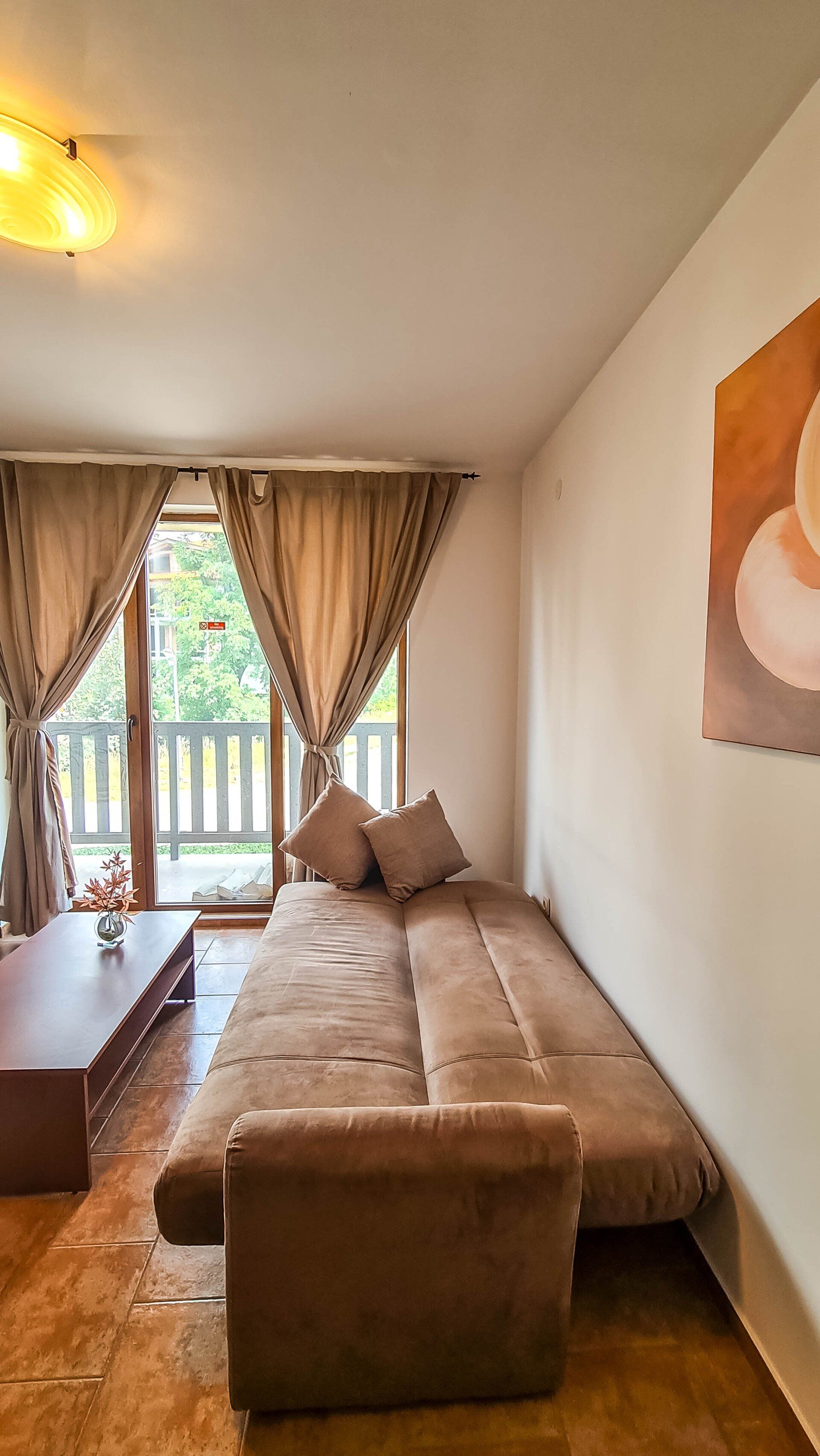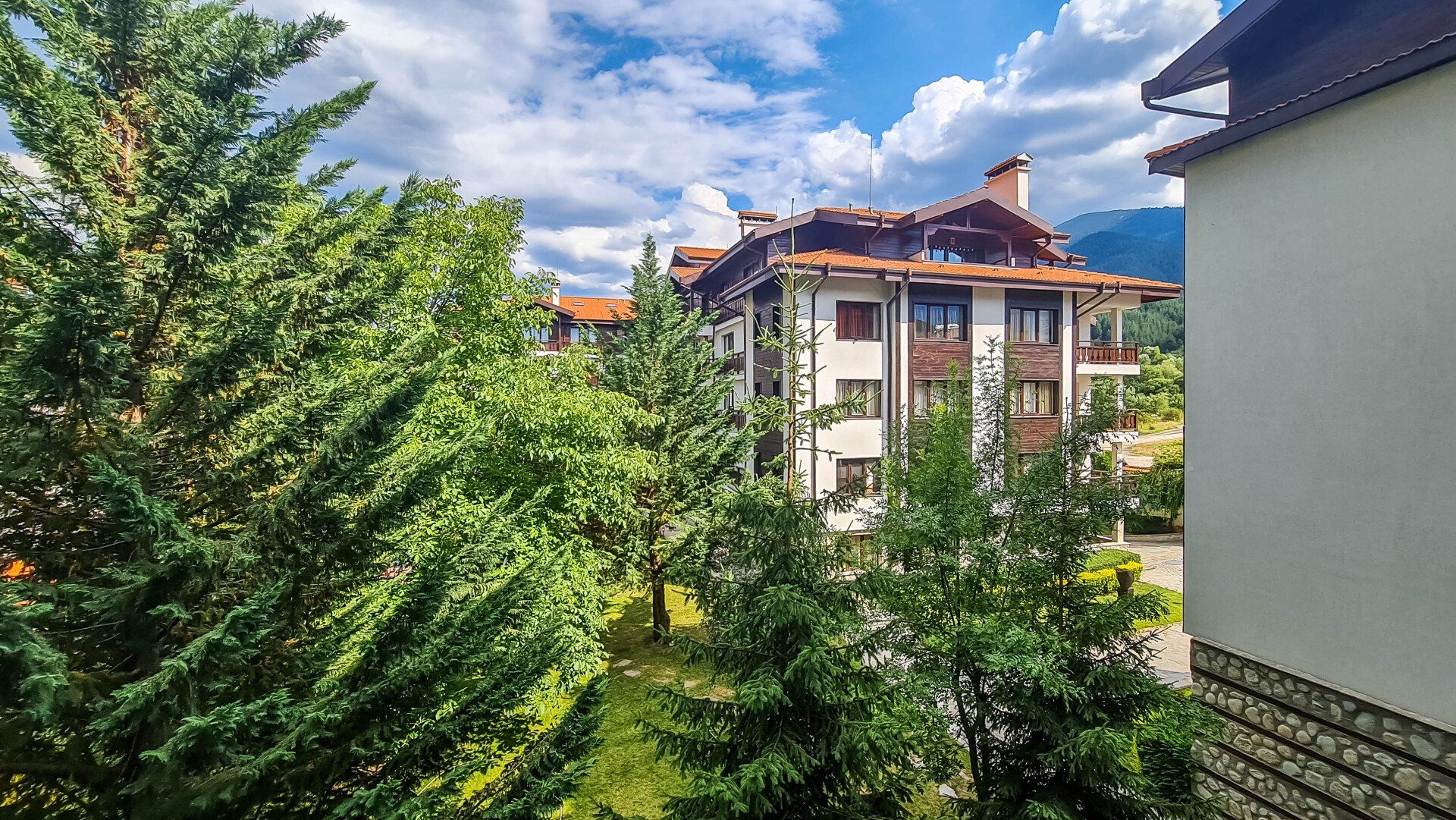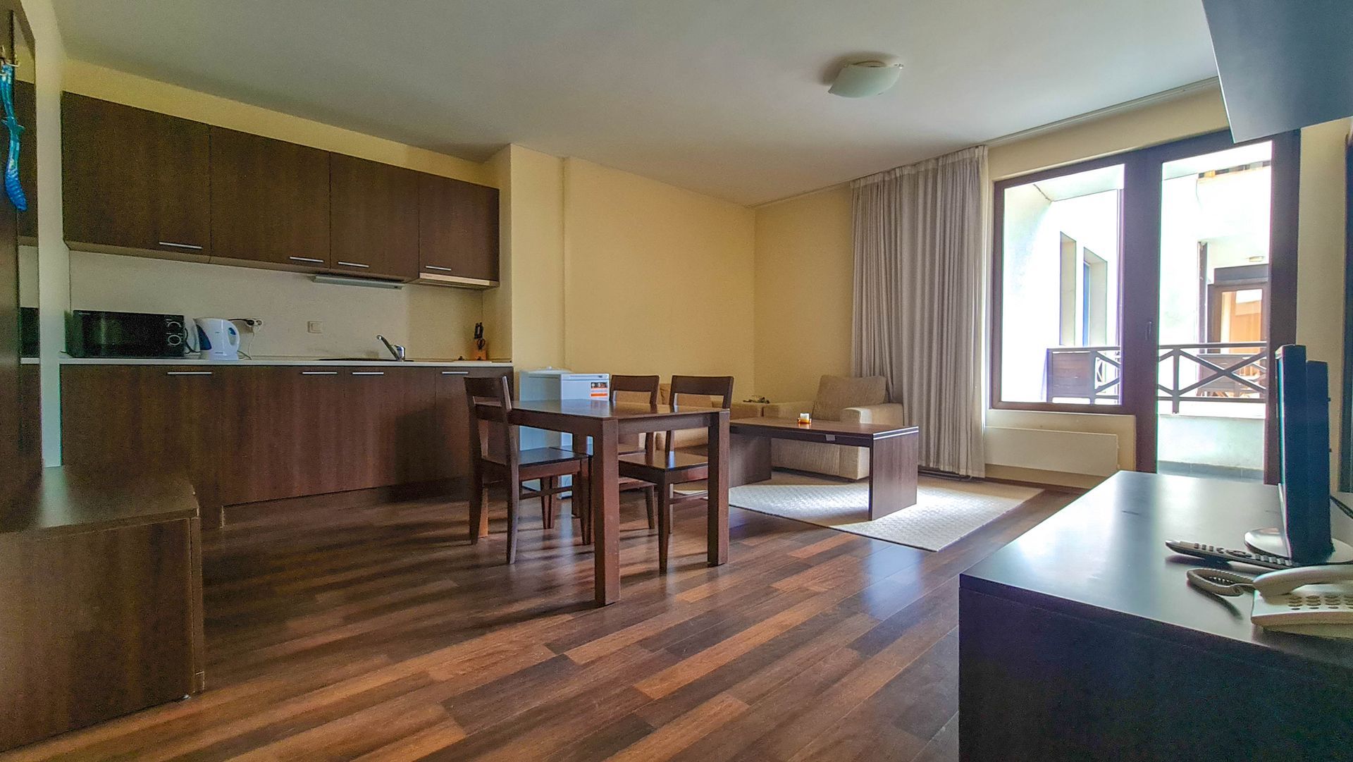 The apartment has a cozy bedroom for 3 people, beautiful balcony with mountain views, a storage room with a washing machine and a water heater.