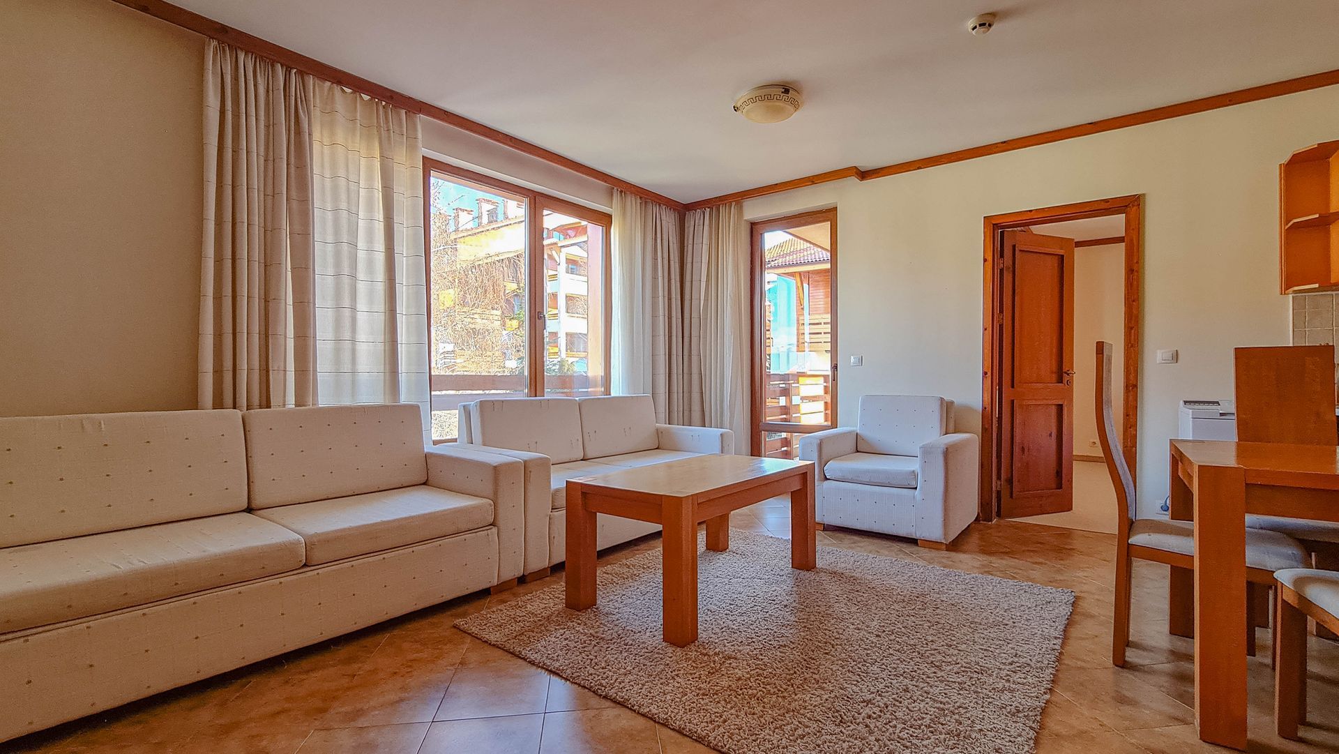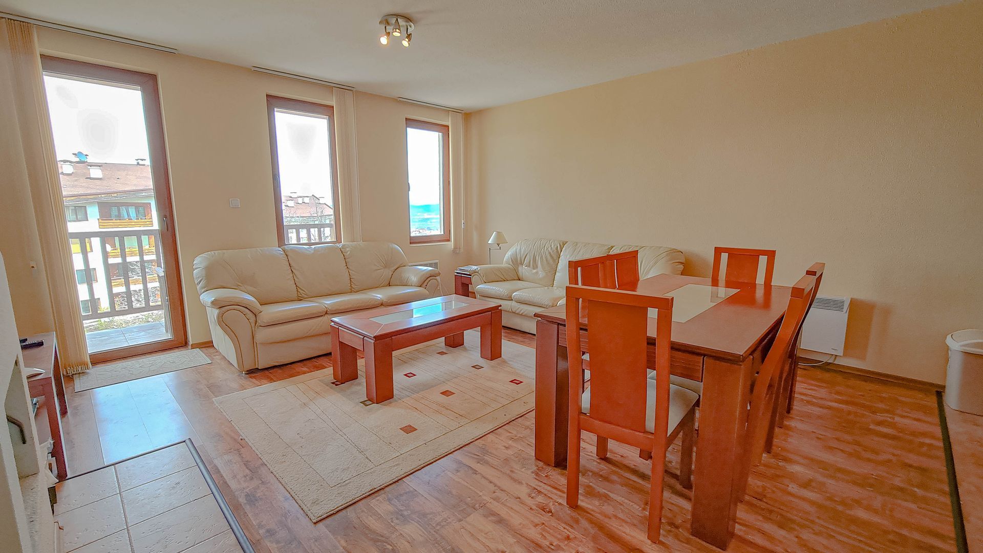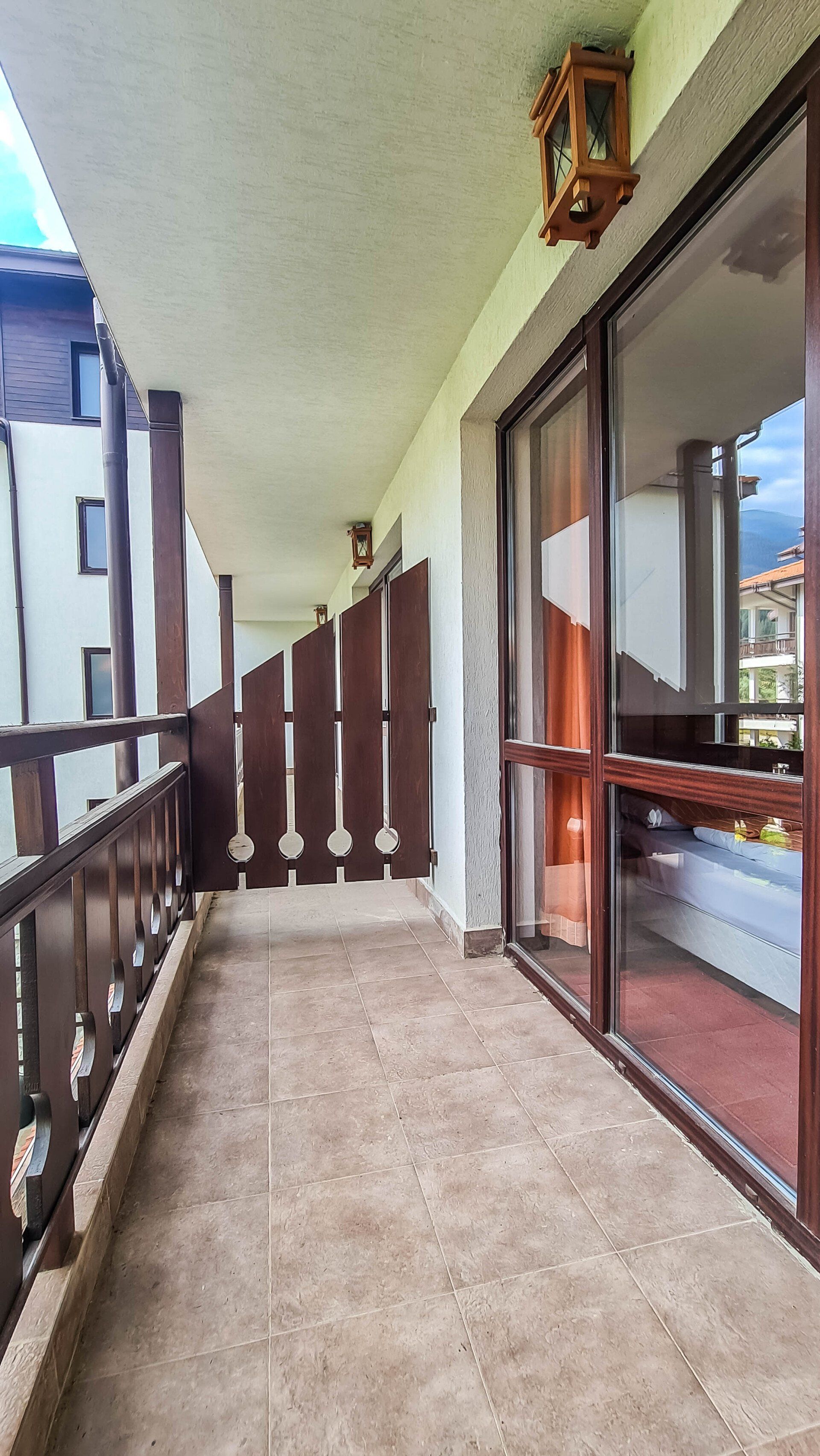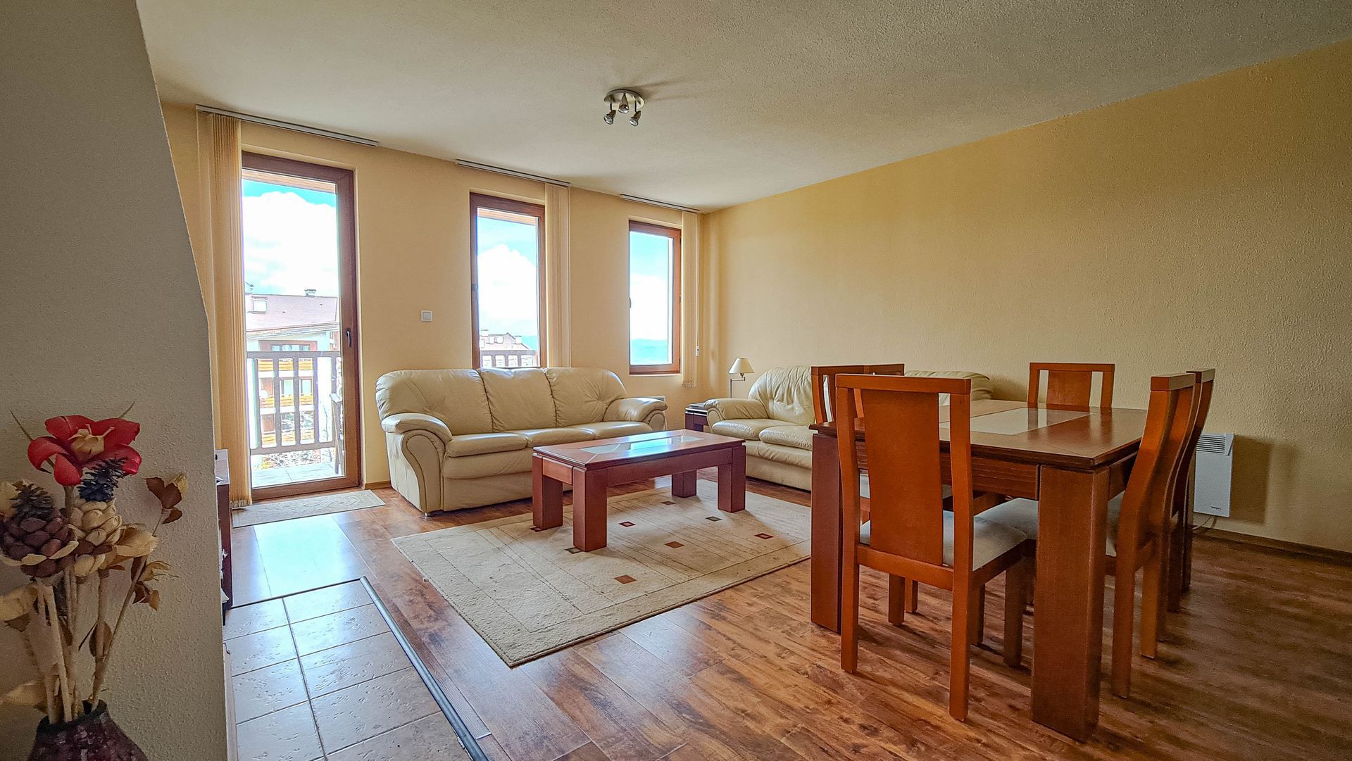 The apartment has a cozy bedroom for 3 people, beautiful balcony with mountain views, a storage room with a washing machine and a water heater.