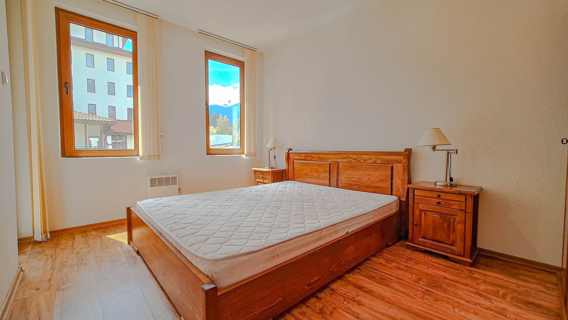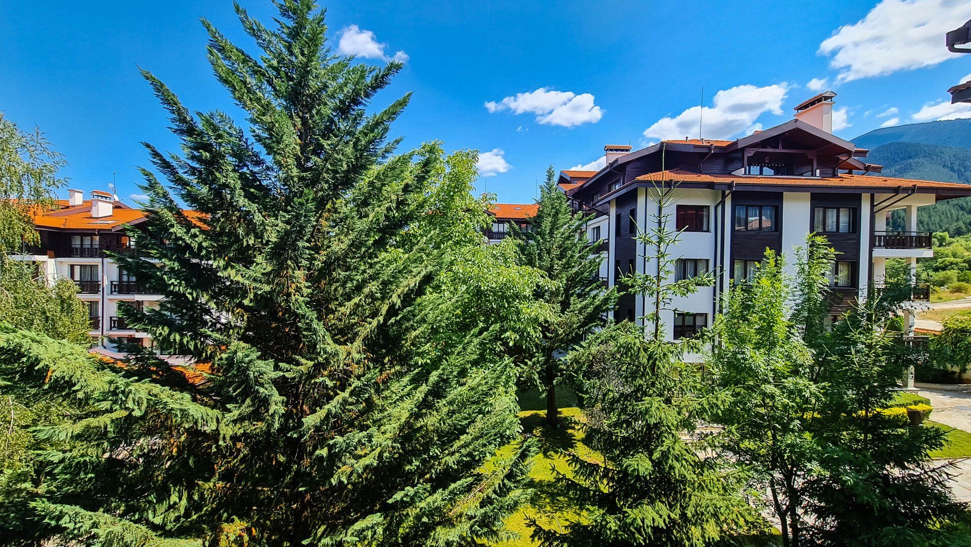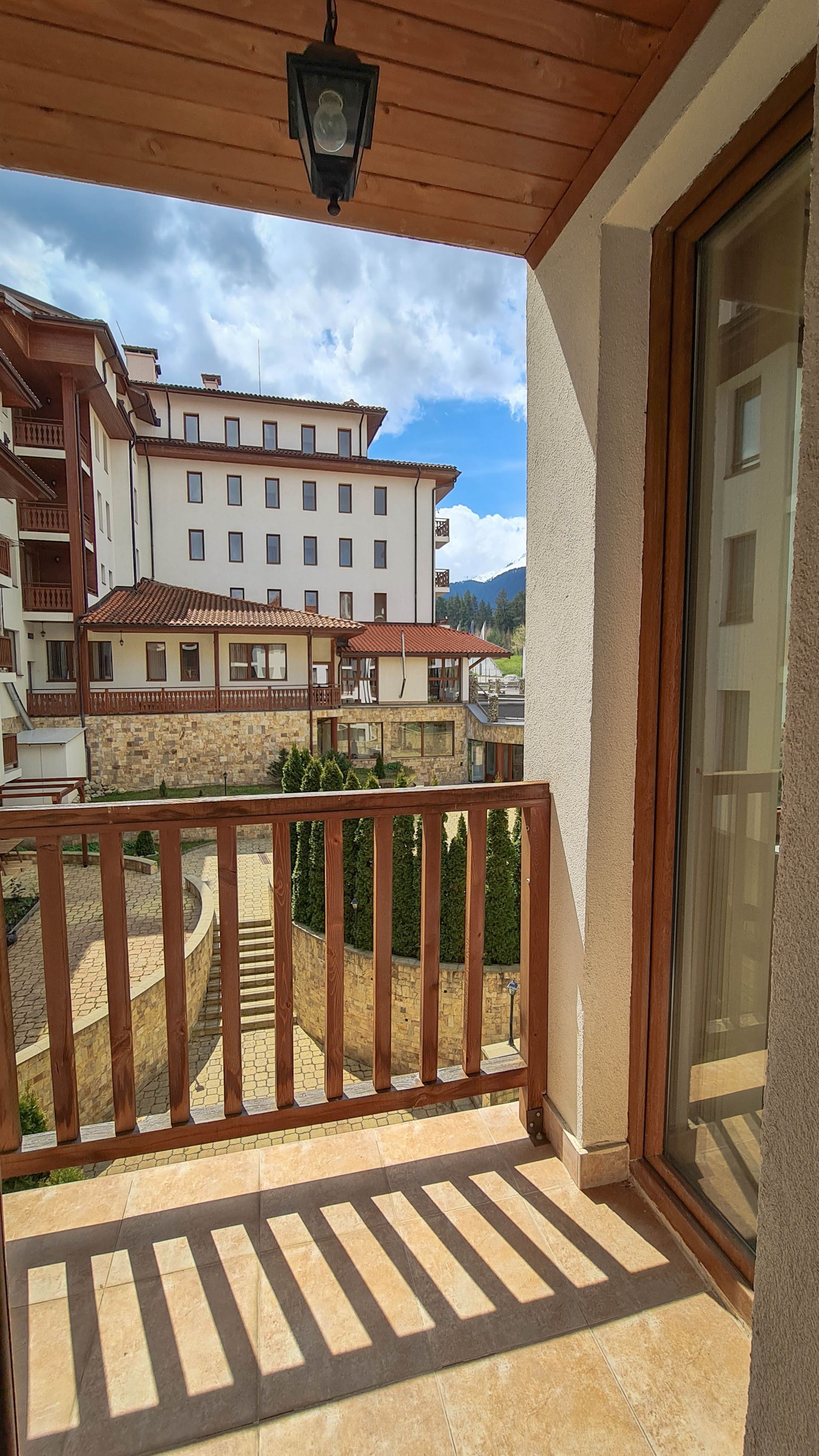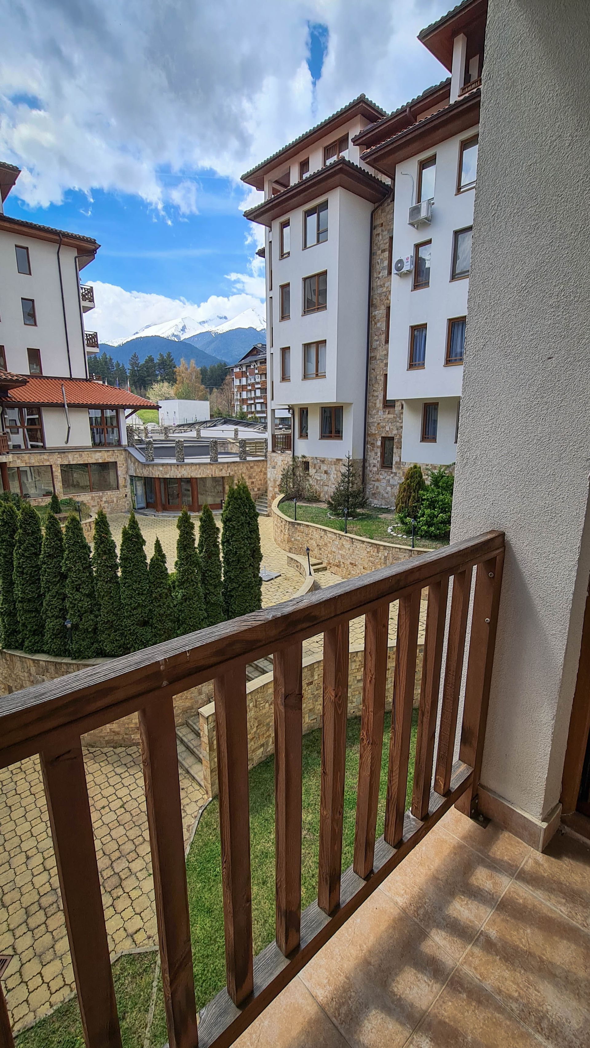 - Two bedrooms, living room, two toilets, bathroom, a balcony with a mountain view
