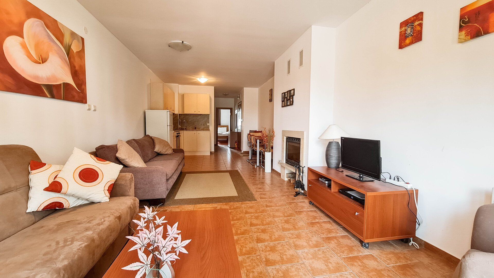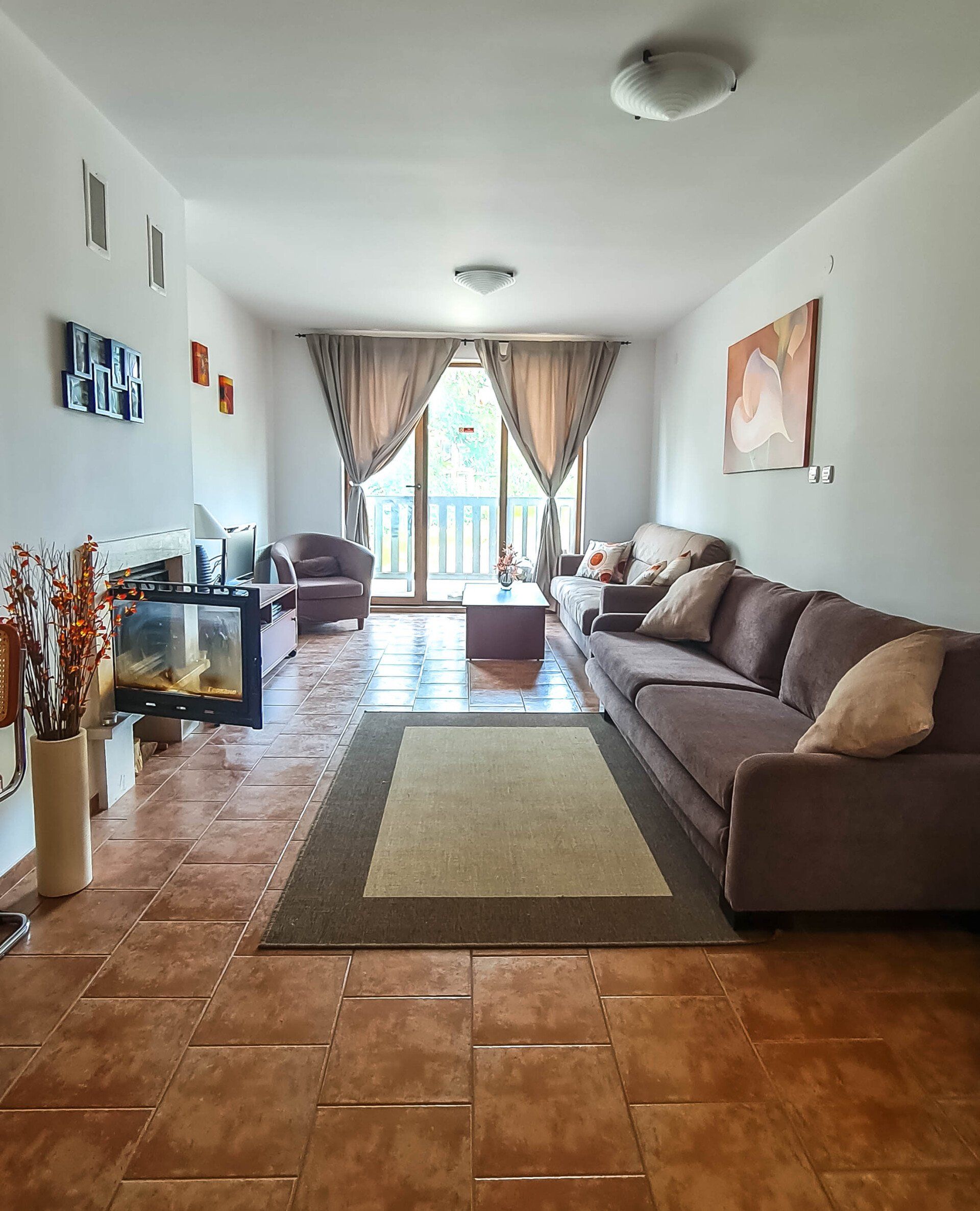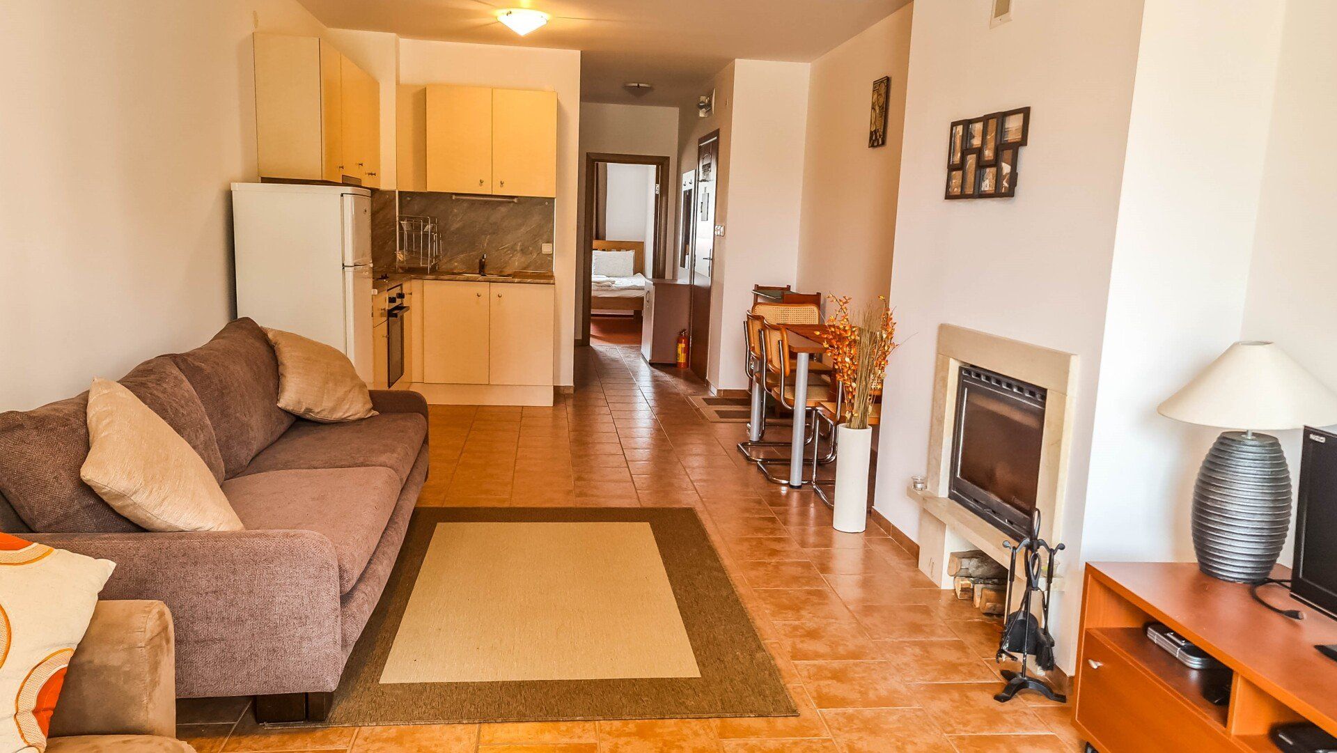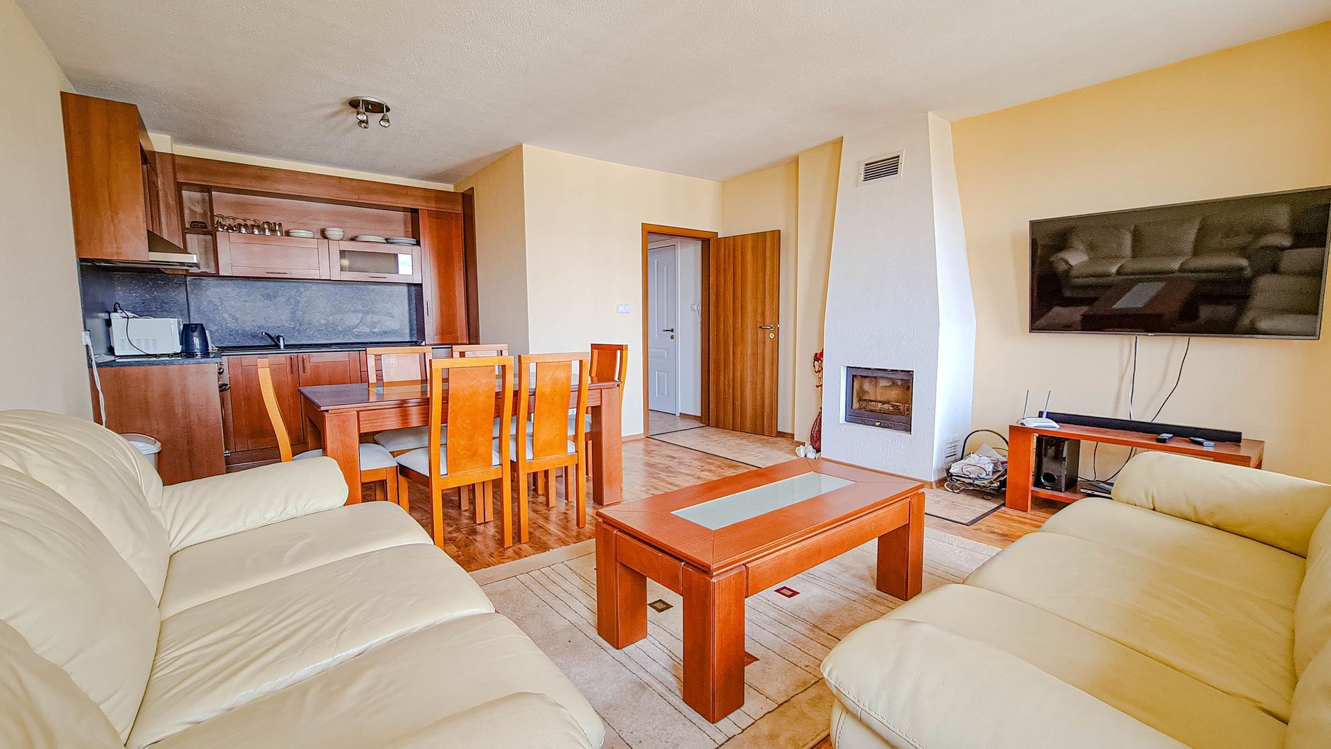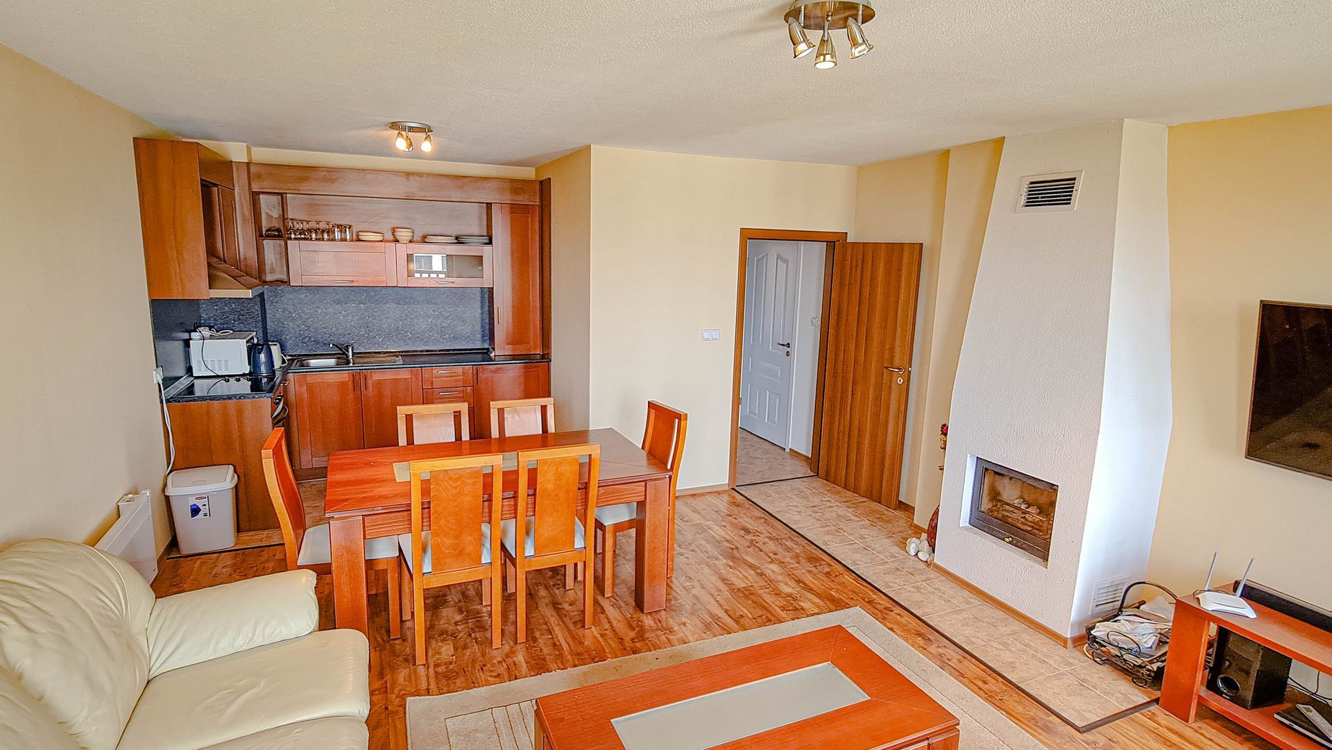 It has a large American-style living room that has a fireplace, large sofas (one of them could be transformed to a double-bed), a TV, Internet, a dining table with 4 chairs and a kitchen corner with a refrigerator, ceramic hob, microwave, a dish washer, a kettle and a toaster.
