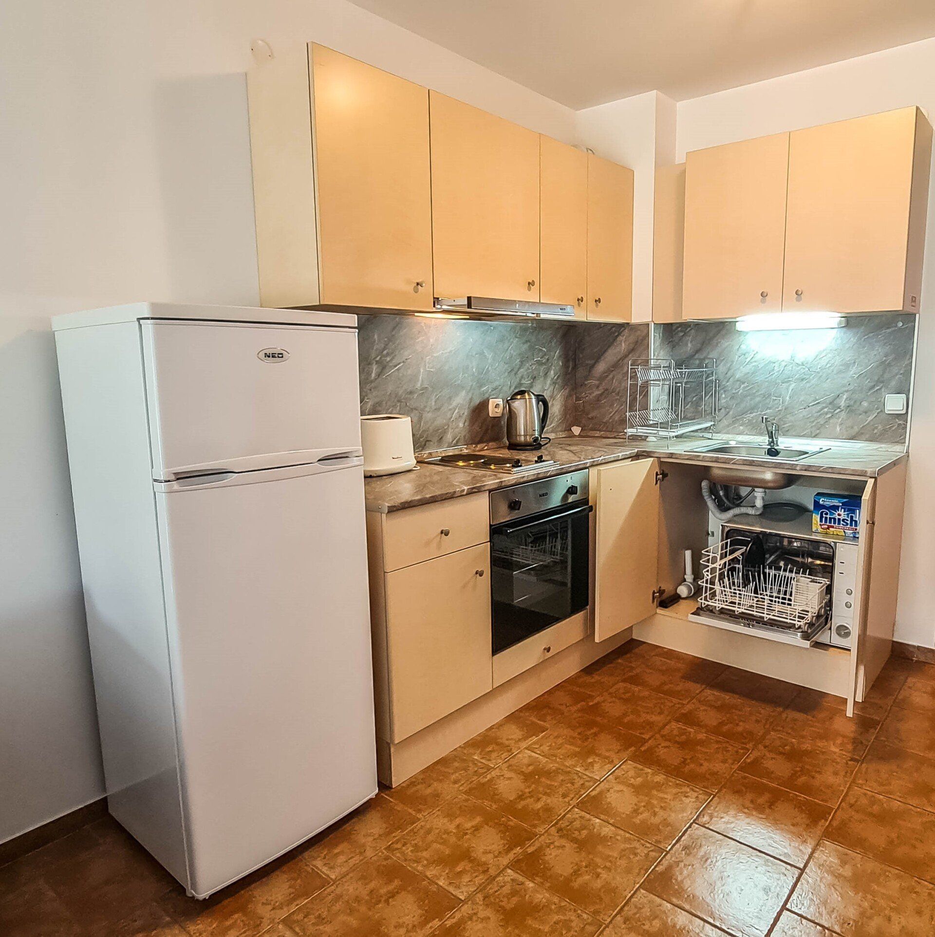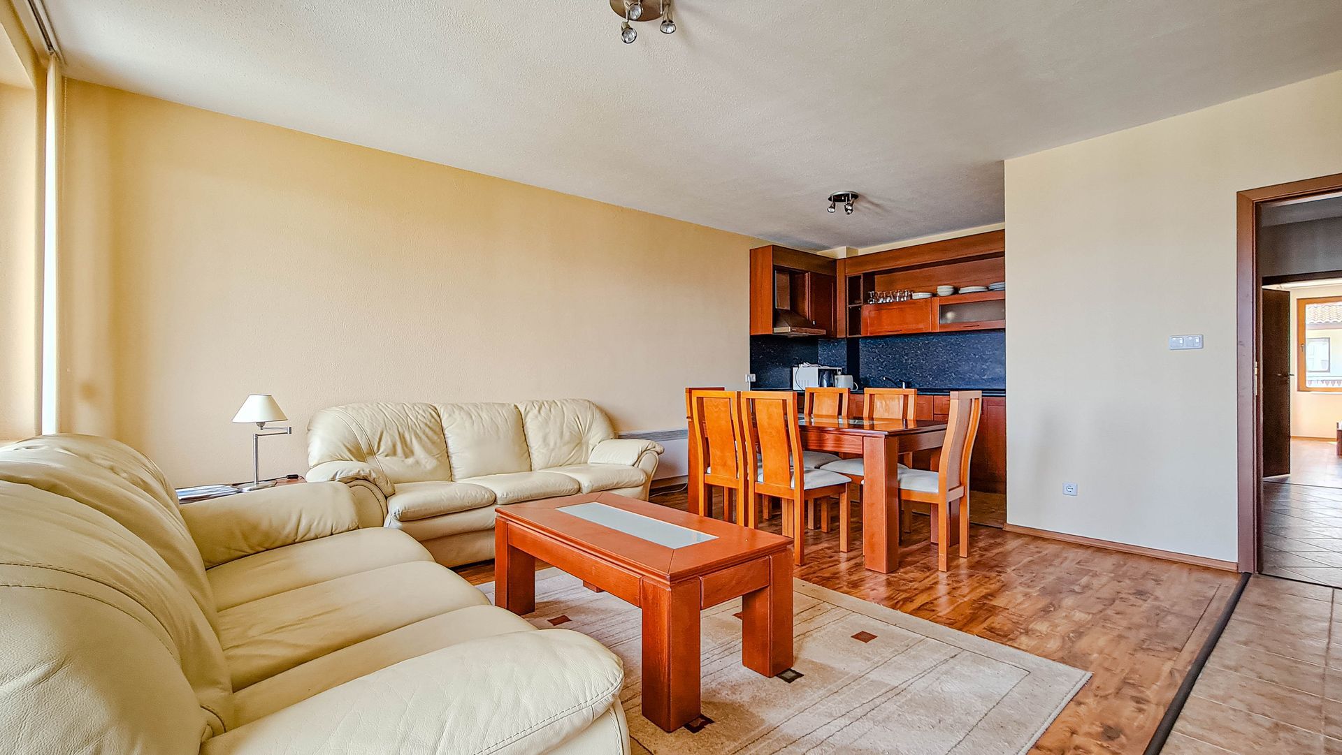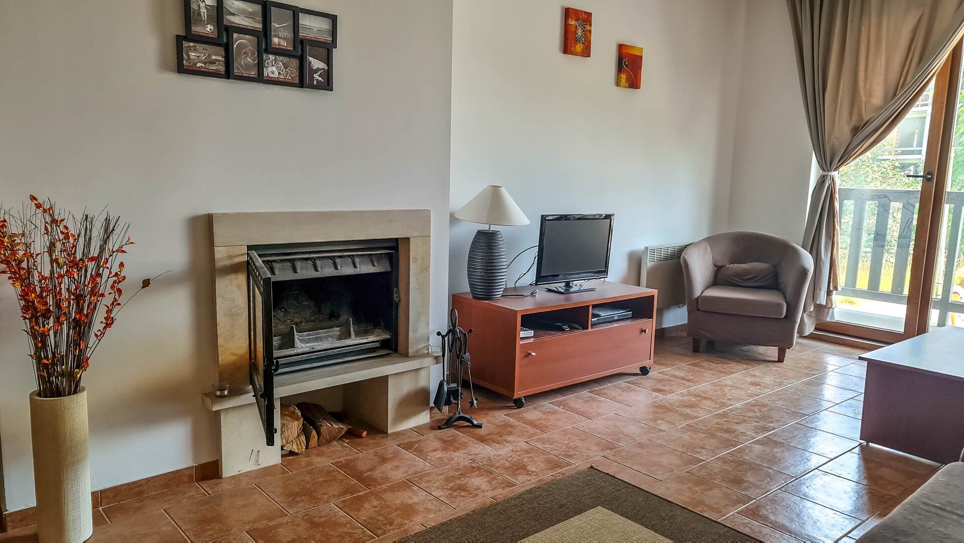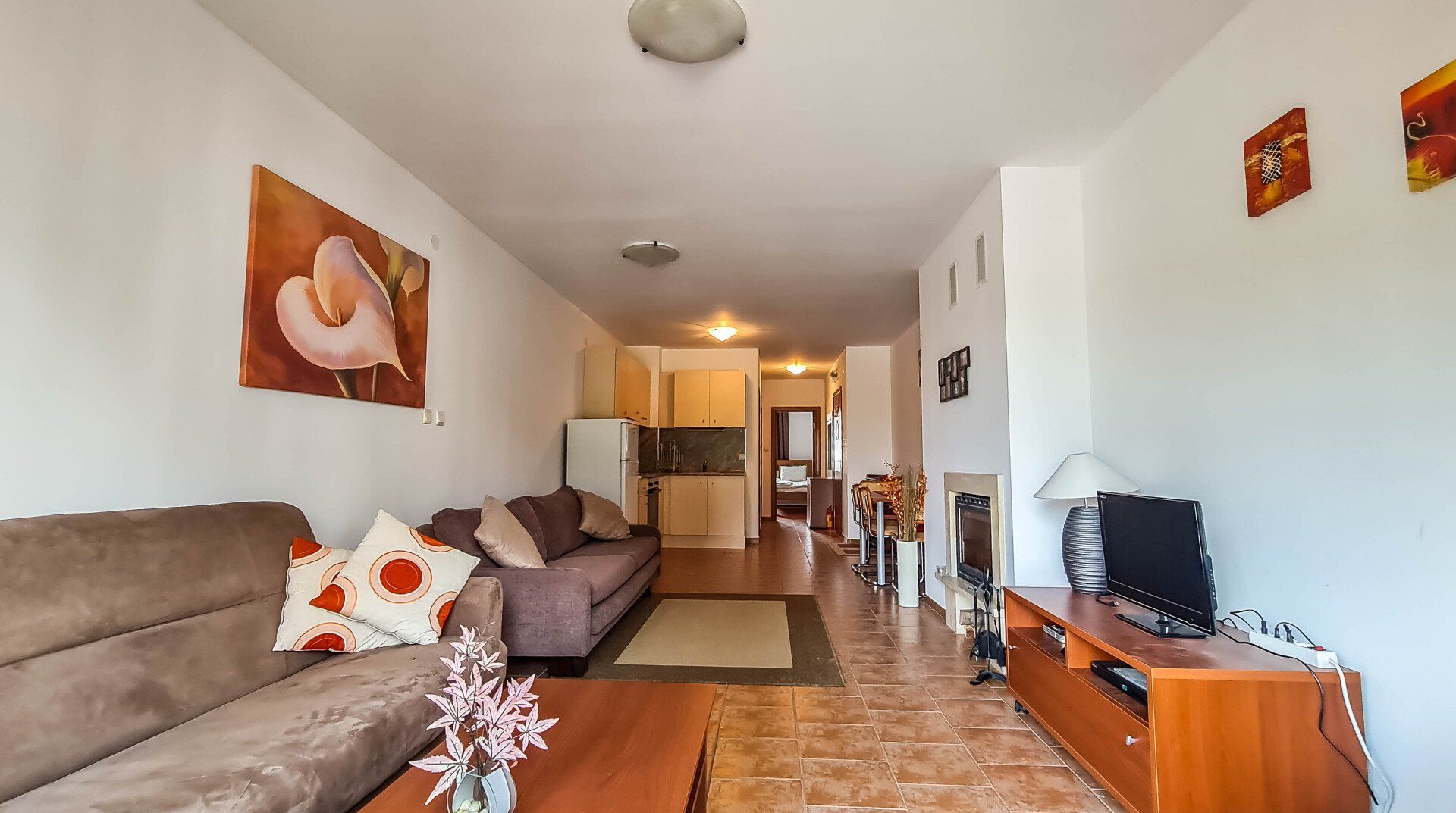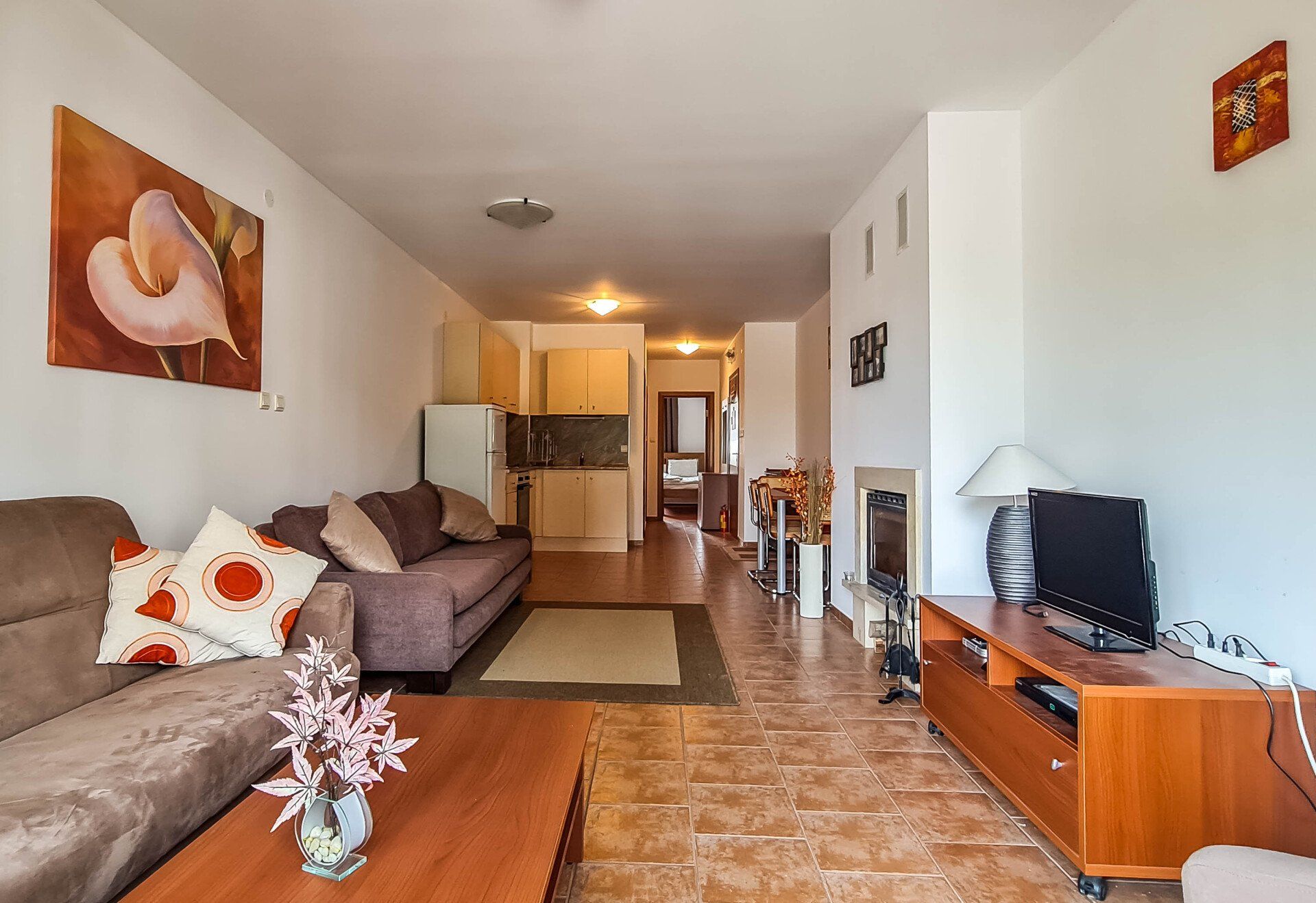 It has a large American-style living room that has a fireplace, large sofas (one of them could be transformed to a double-bed), a TV, Internet, a dining table with 4 chairs and a kitchen corner with a refrigerator, ceramic hob, microwave, a dish washer, a kettle and a toaster.