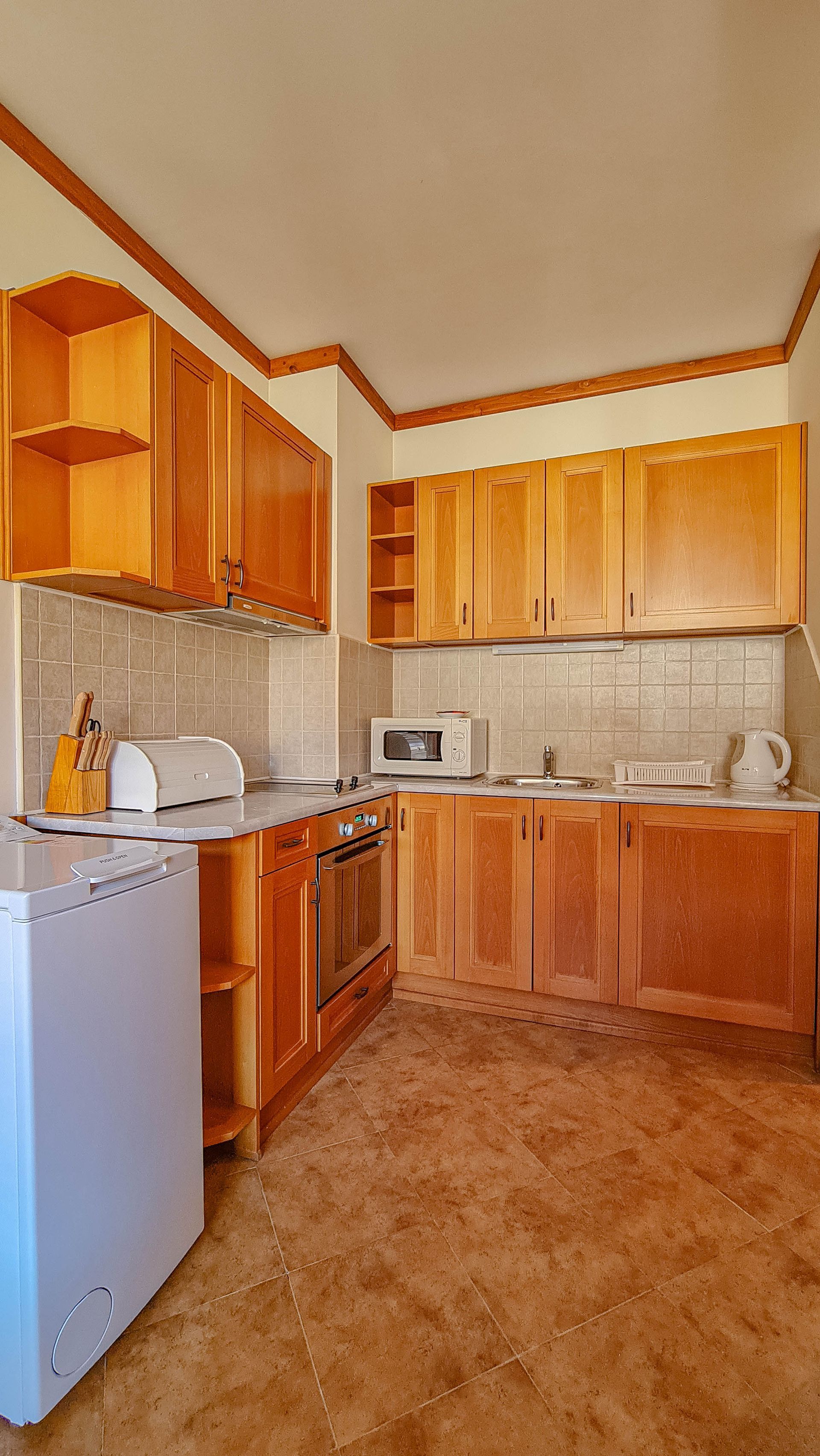 Two balconies, a washing machine, a stove and a huge bath.